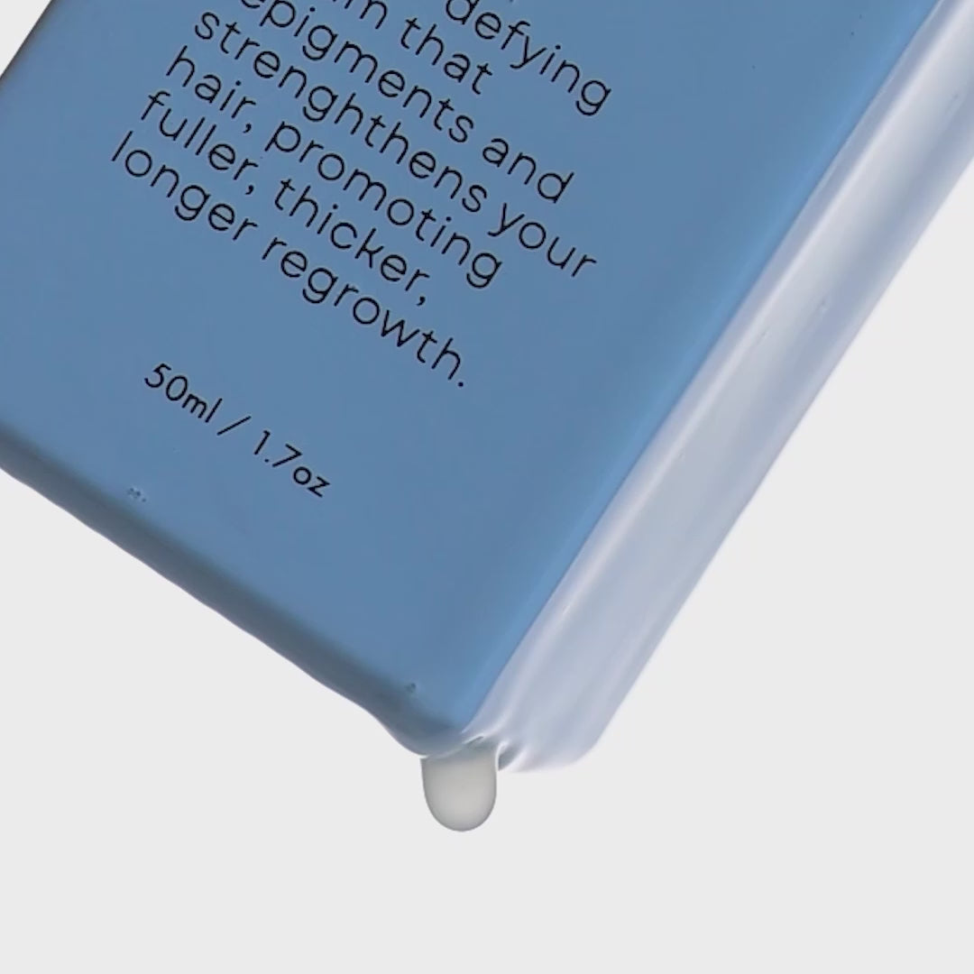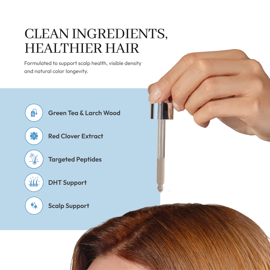 Our Hair Serum is a concentrated, lightweight scalp treatment designed to support the appearance of thicker, fuller, stronger-looking hair. It helps boost hair vitality, support a healthy-looking scalp, and delay the appearance of premature grays with consistent use.